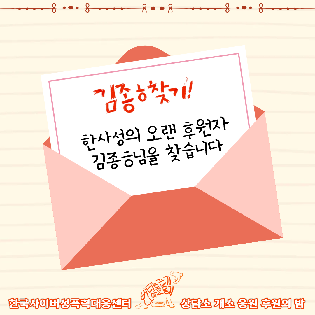 한사성에 무려 8년째 후원해주고 계신 미스터리하고도 든든한 후원자, "김종ㅎ"님을 찾고 있습니다.