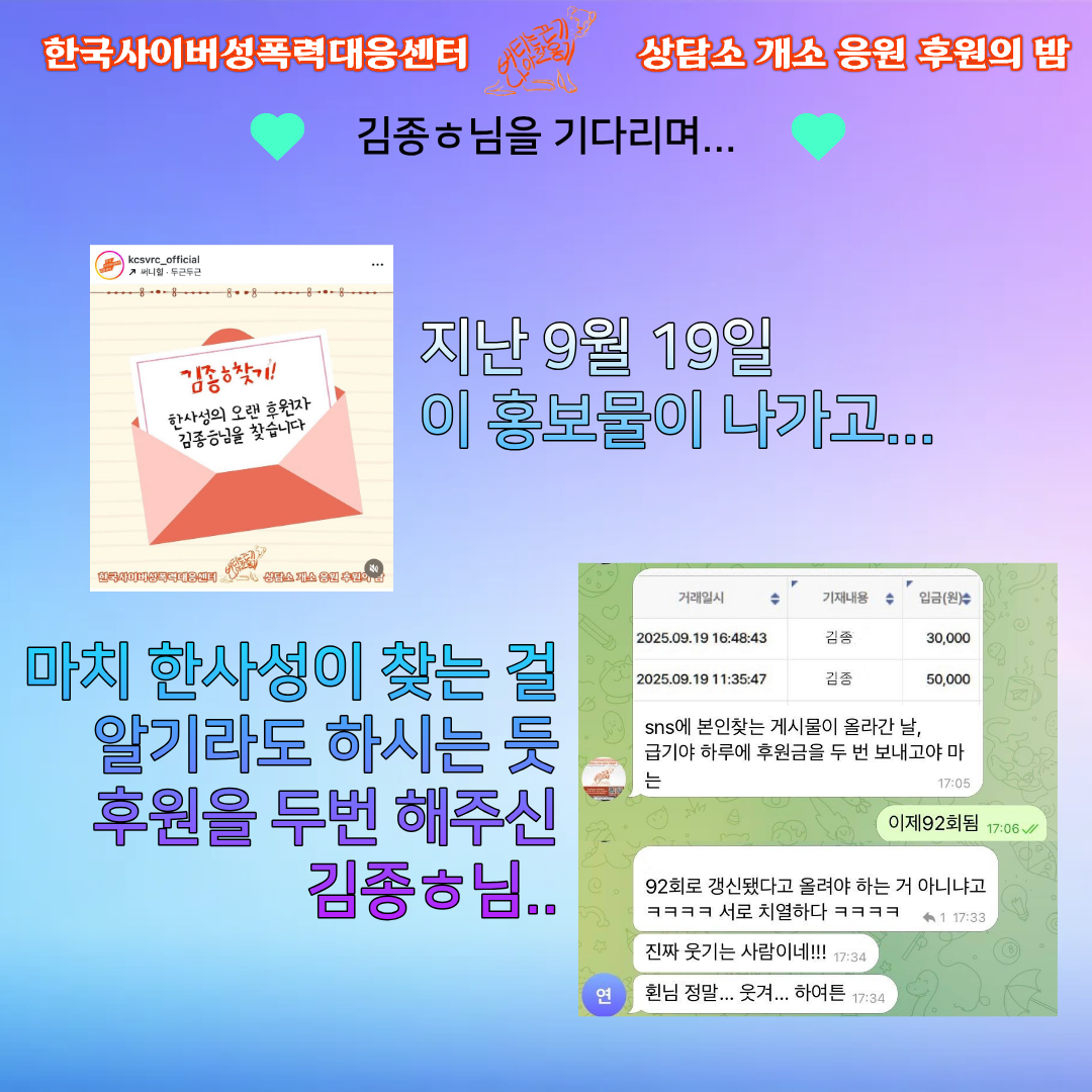 무려 8년간, 94회를 미스터리하게 후원해주고 계신 김종ㅎ님. 후원자님을 찾고자 sns게시물을 한차례 올렸지만 아직 제보도 소식도 없어요. 한사성은 과연 다가오는 후원의밤에 김종ㅎ님을 초대할 수 있을까요?