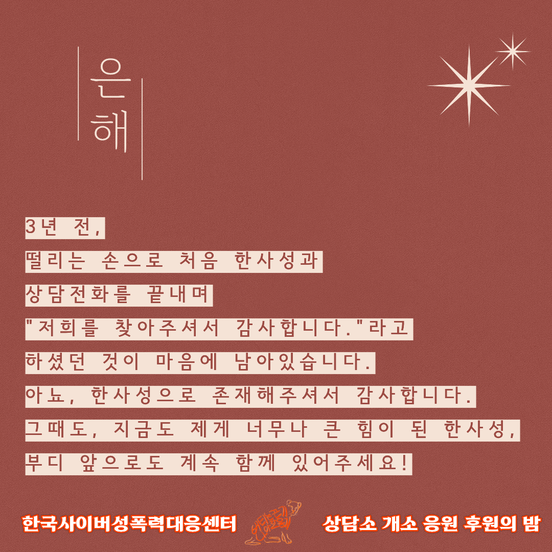 한사성 상담소 개소 응원 후원의 밤이 일주일 앞으로 다가왔습니다. 한사성의 피해지원자 은해, 고사리, 경아 님께서 응원하는 마음을 담아 편지를 보내주셨어요. 눈물이 핑 도는 감동의 편지를 보내주신 세 분의 피해경험자께 다시 한번 감사드립니다.
